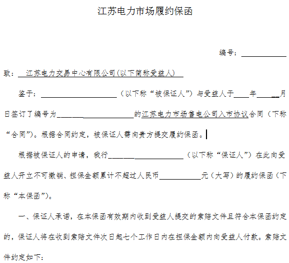 所有注册生效(含外省推送生效)的售电公司在参与江苏电力市场交易前,应根据签约用户年度用电量总和,向交易中心提供银行履约保函,交易中心常态受理售电公司履约保函,同时为简化手续、规范流程,特作如下说明: