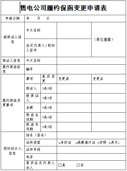 5.售电公司履约保函办理生效后发生变更的,应在电力交易平台提交履约保函变更申请,上传履约保函变更申请表(详见附件5)及变更后的履约保函正本电子扫描件,交易中心受理后,通知售电公司现场提交或邮寄纸质原件至交易大厅,交易中心收取后在交易平台向公众公示履约保函变更生效信息,变更内容包括但不限于被保证人名称变更、有效期延长、金额调增调减等。
