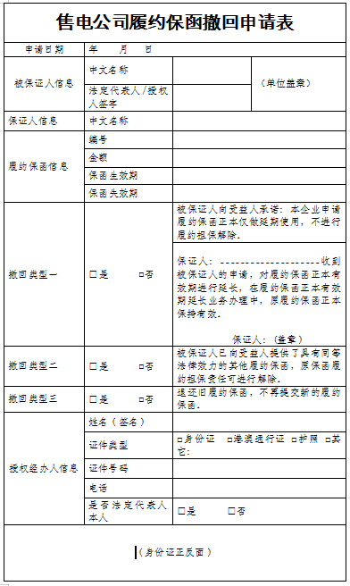 6.售电公司欲撤回已提交履约保函的,应在电力交易平台提交履约保函撤回申请,上传履约保函撤回申请表(详见附件6),交易中心校验交易结算执行情况,确认具备撤回条件后,将通知售电公司现场提交纸质原件至交易大厅,交易中心收取后,现场向售电公司退还履约保函正本,在交易平台向公众公示履约保函撤回信息。